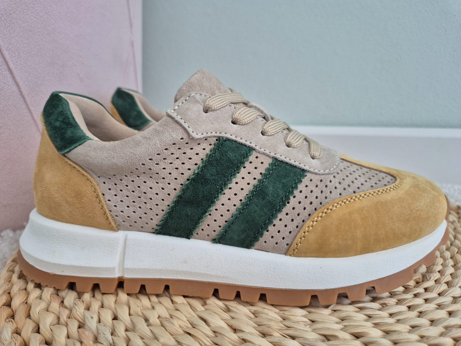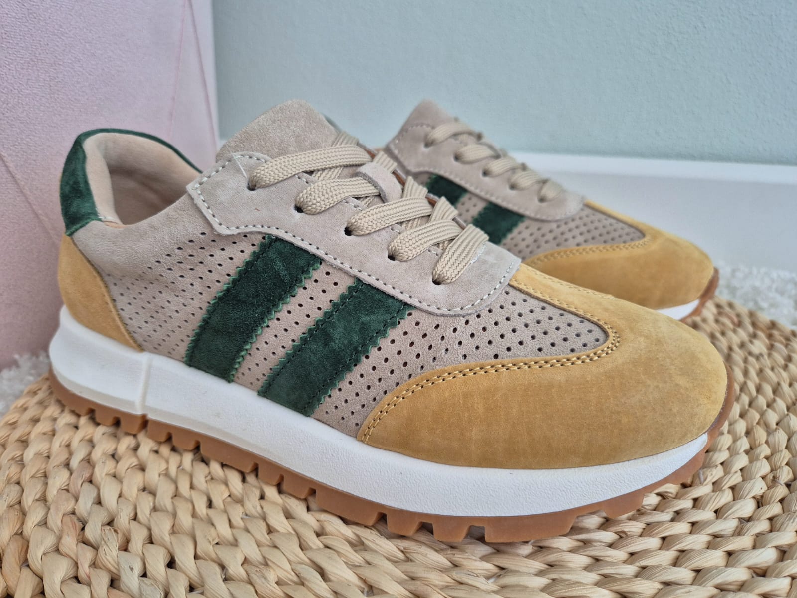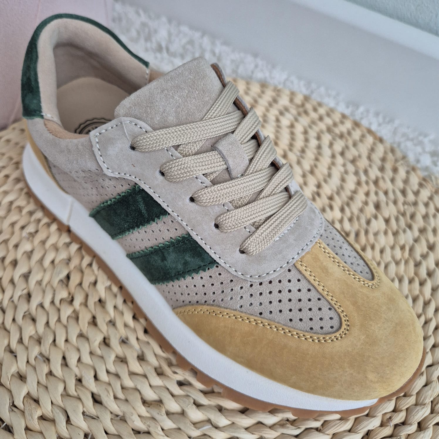 - Kolor: beżowy z dodatkiem zieleni