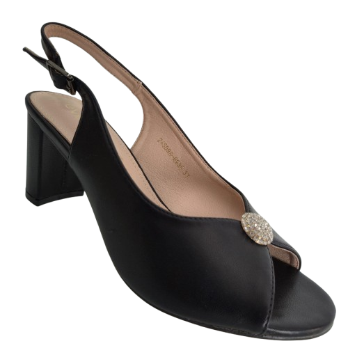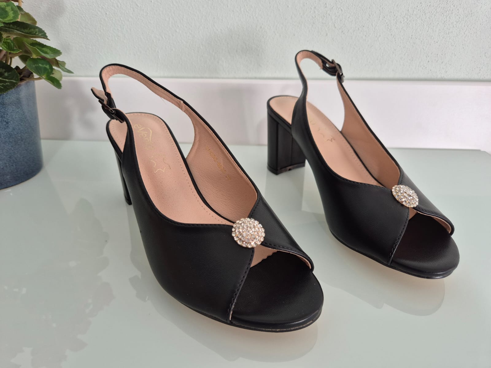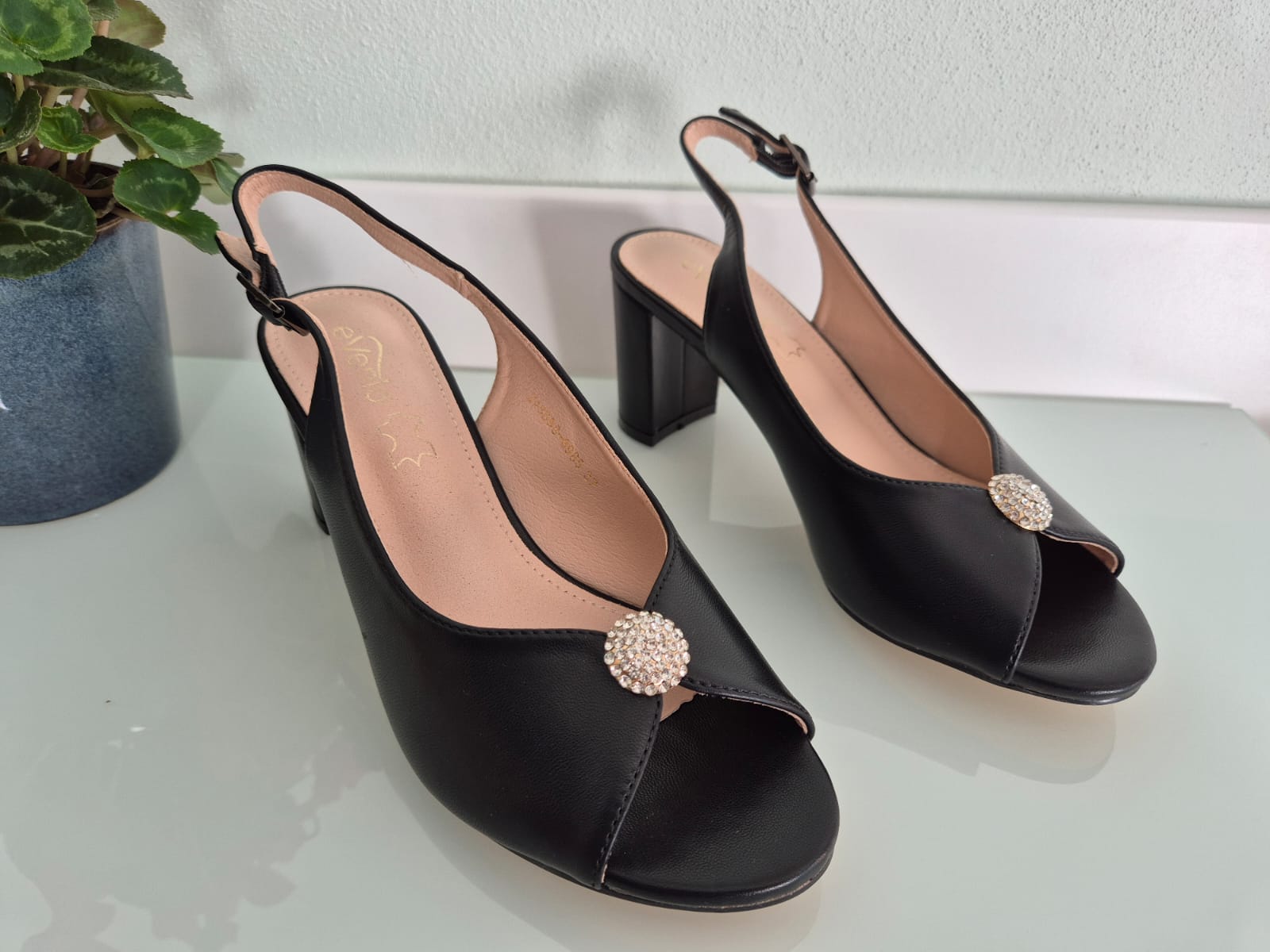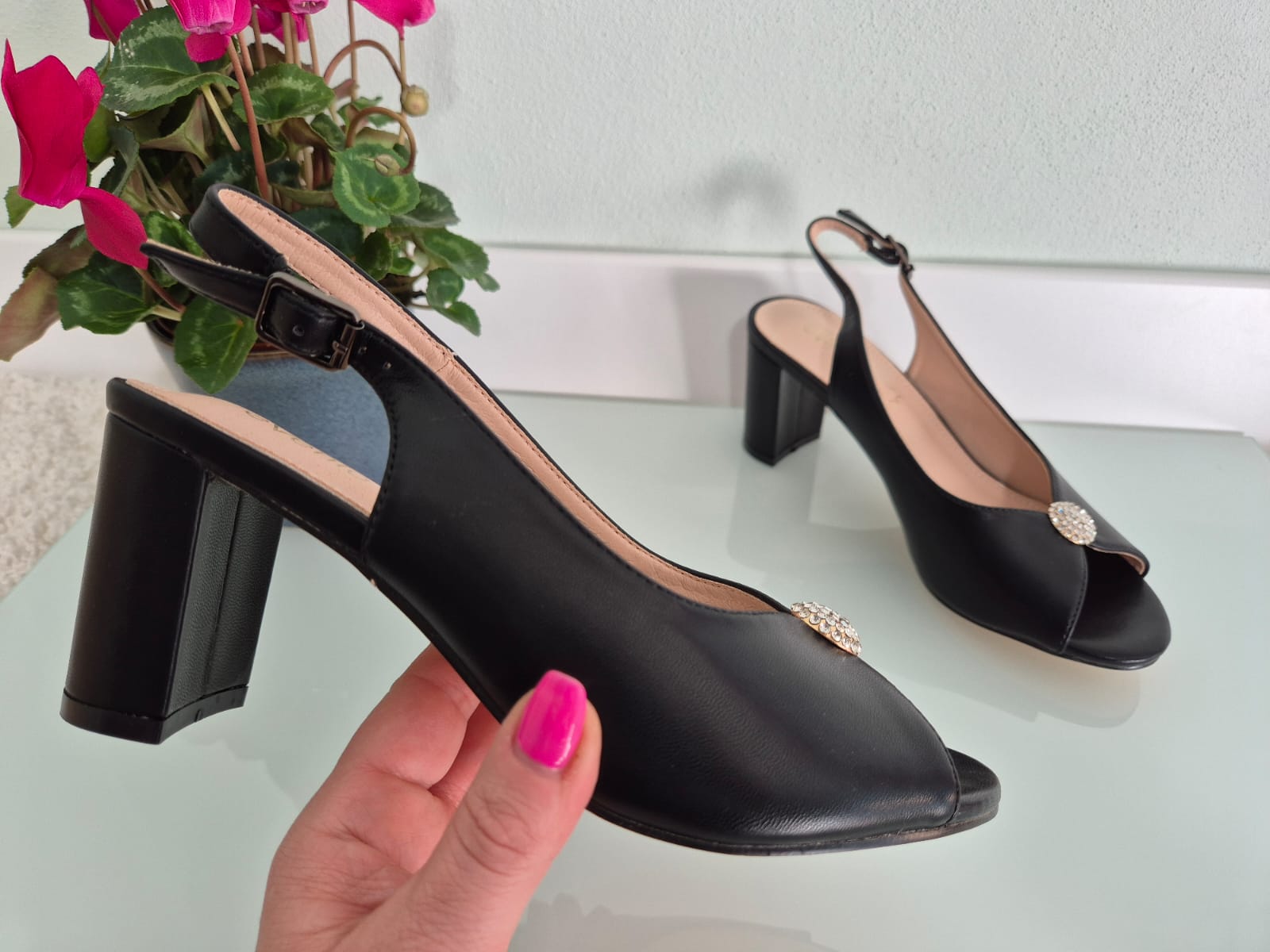 Eleganckie, stylowe i niezwykle wygodne sandały damskie w czarnym kolorze z wyższym obcasem typu słupek. Wysoki obcas poprawi wizualnie Twoją sylwetkę, wydłuży nogi oraz wysmukli talię. Wykonane zostały z miękkiej skóry ekologicznej ze skórzaną wkładką, która zapewni dobre ułożenie stopy w bucie. Regulowane zapięcie na sprzączkę pozwoli na dopasowanie obuwia do indywidualnej szerokości stopy. Subtelna ozdoba dodaje im uroku i charakteru.