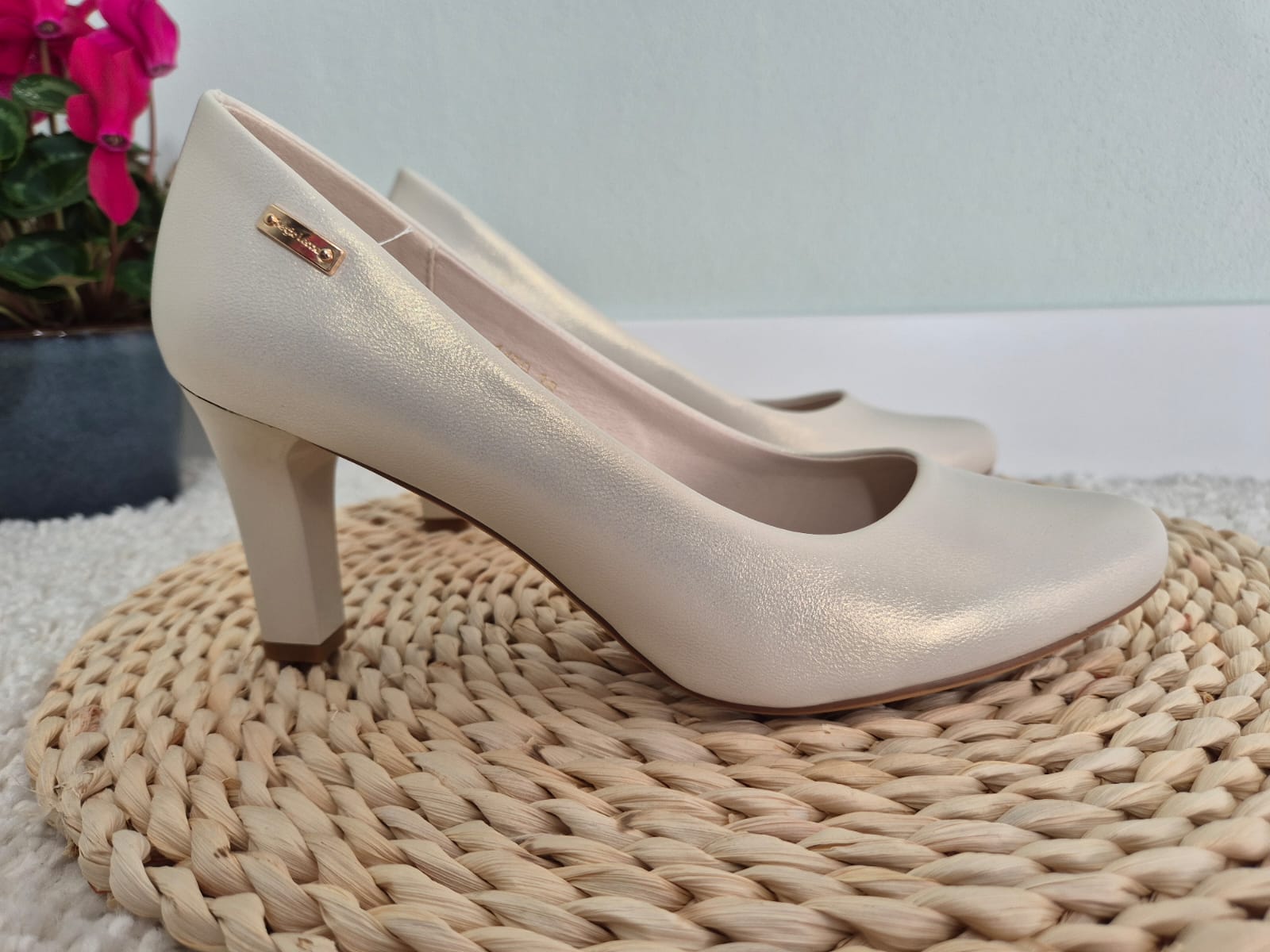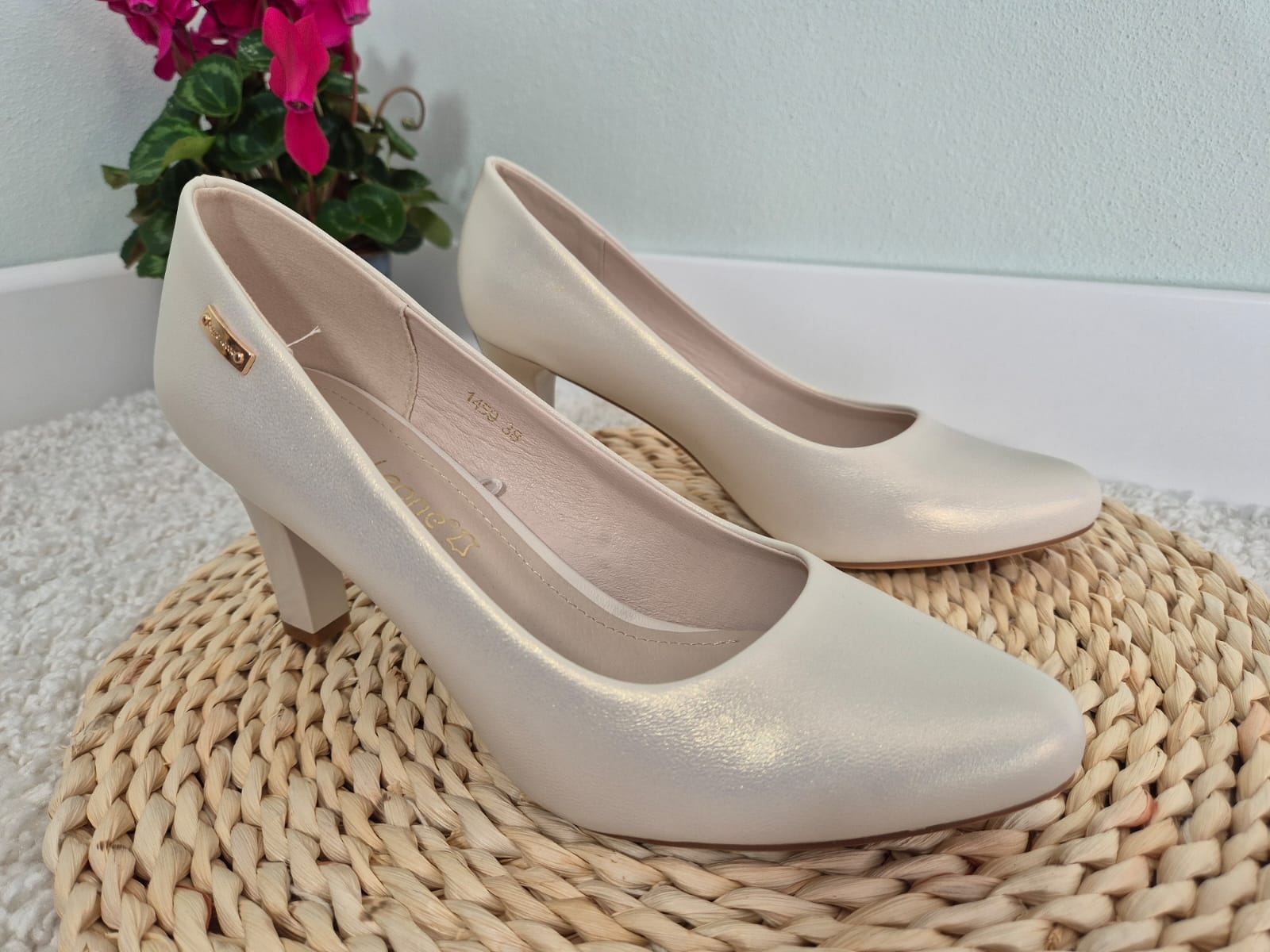 Czółenka Damskie Perła Beżowa Szpilki Na Grubszym Obcasie
