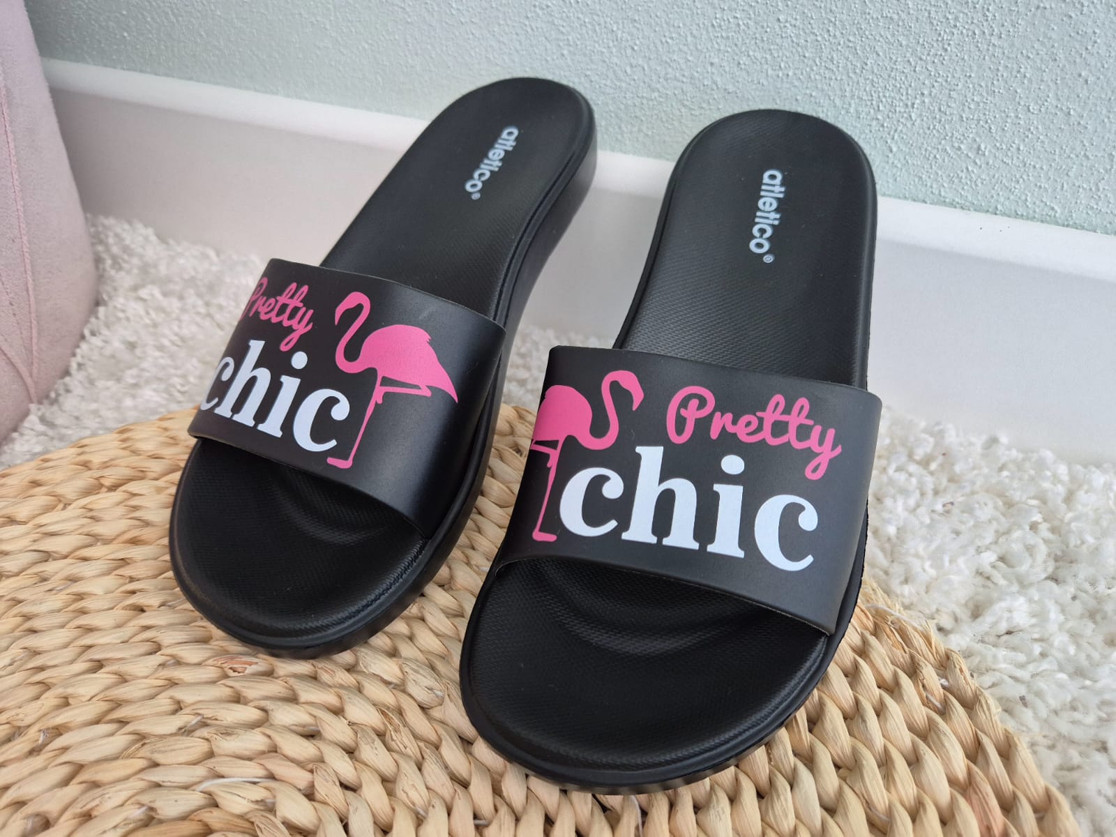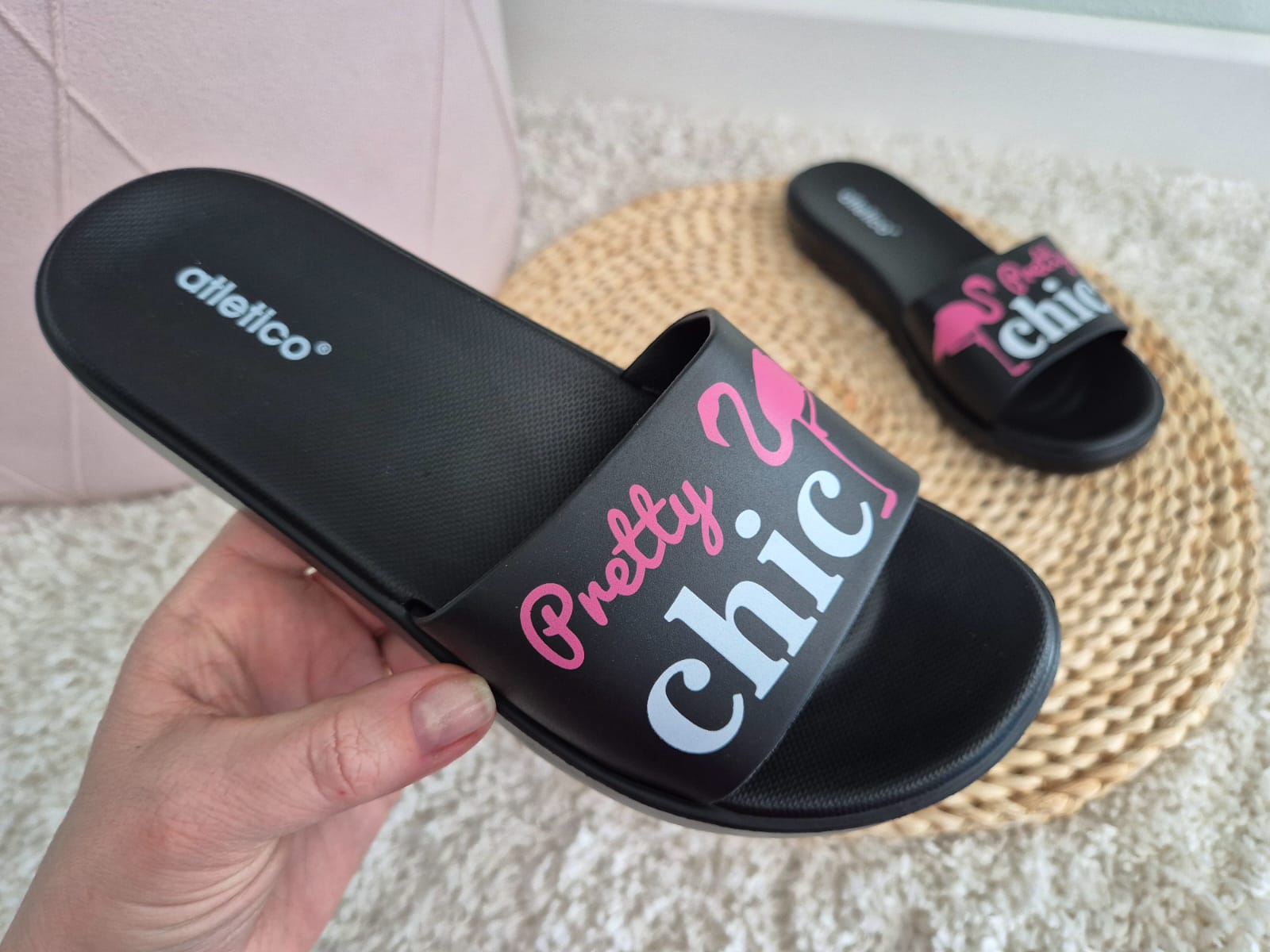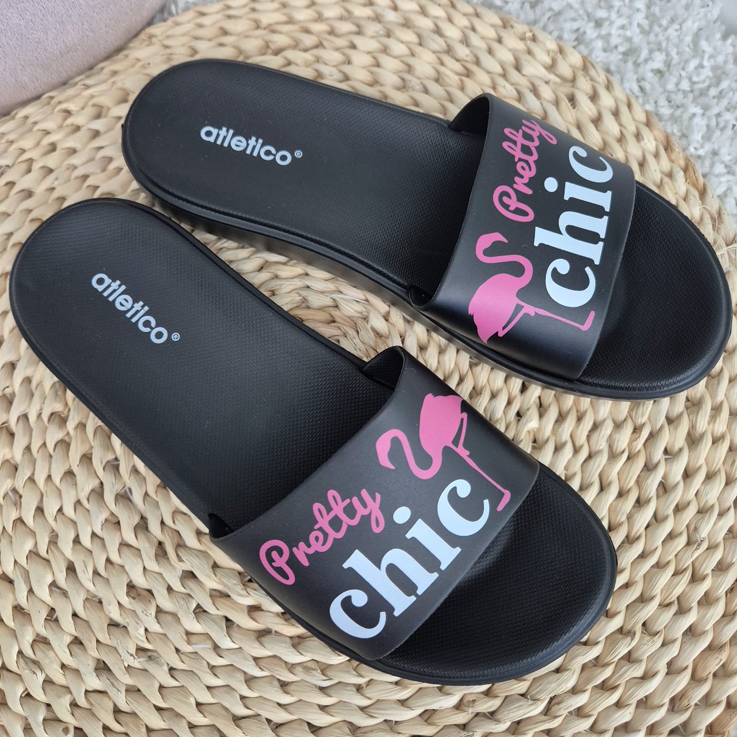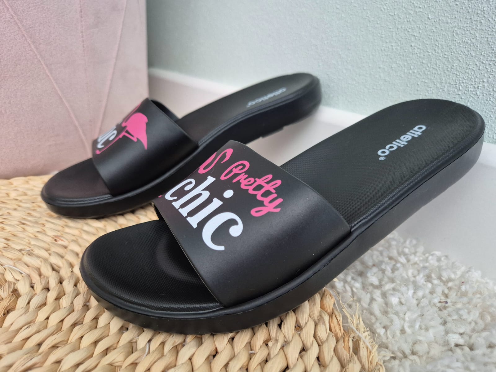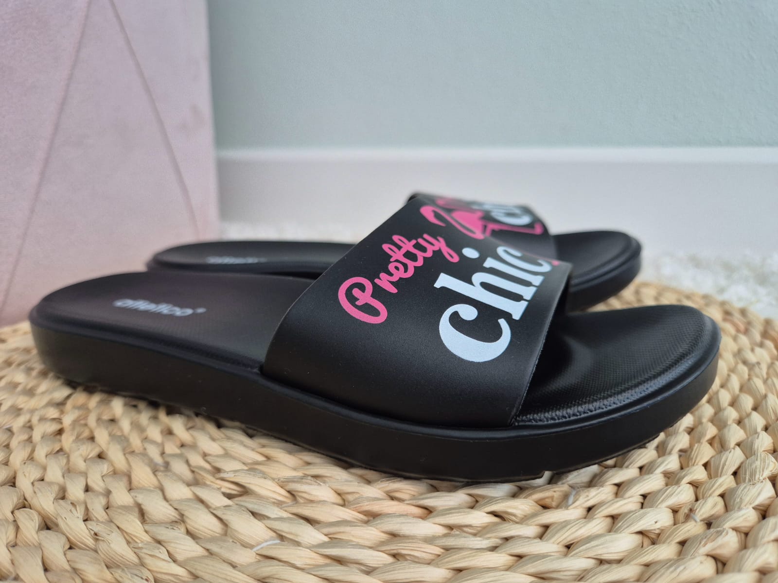 Klapki te zostały wykonane z wysokojakościowej gumy, która jest bardzo wygodna i dobrze amortyzuje stopę. Posiadają antypoślizgową podeszwę. Klasyczny czarny kolor sprawia, ze pasują one do wielu outfitów.