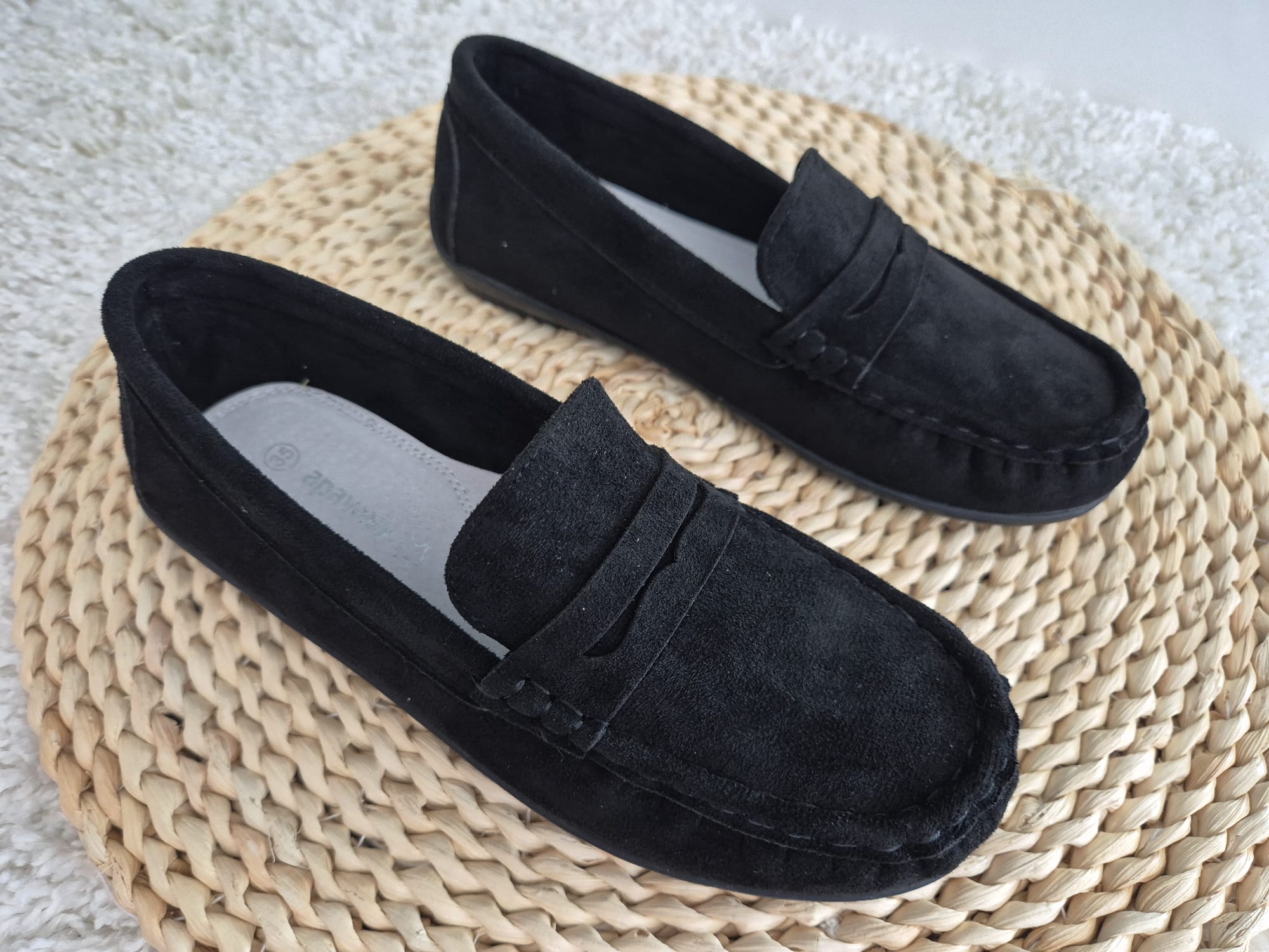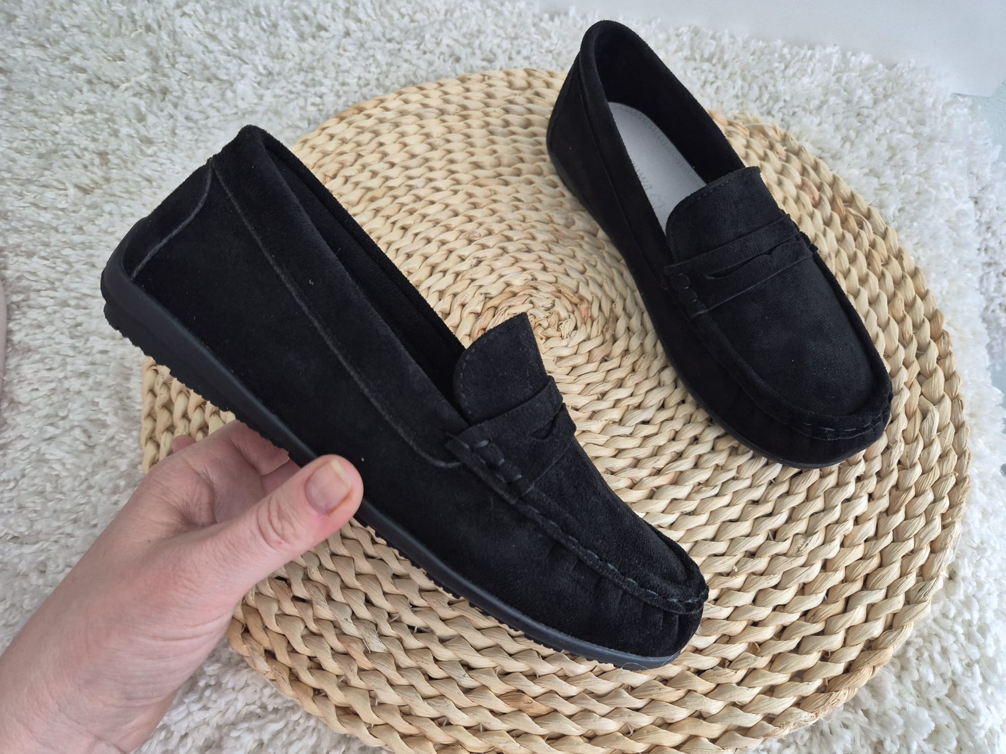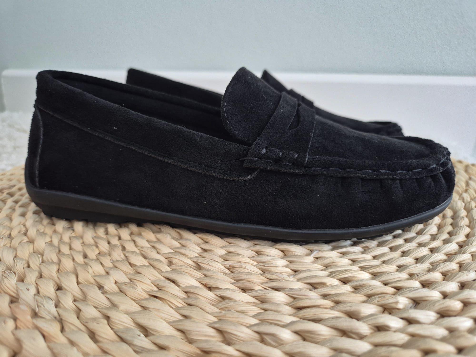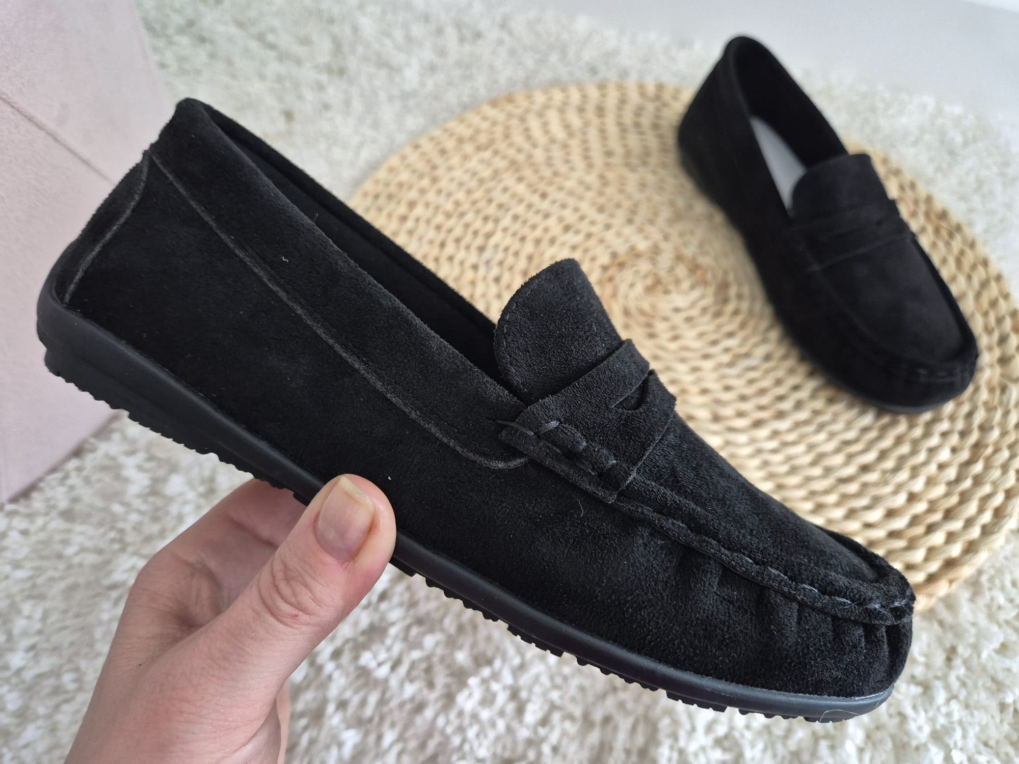 Mokasyny zostały wykonane ze skóry ekologicznej zamszowej, która jest miękka i dobrze dopasowuje się do stopy. Posiadają skórzaną, profilowaną wkładkę oraz charakterystyczne dla mokasyn obszycia. Występują w klasycznym czarnym kolorze.