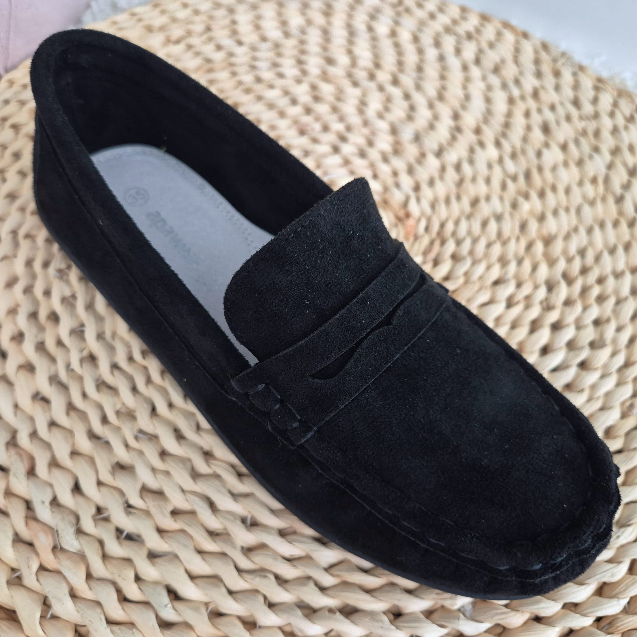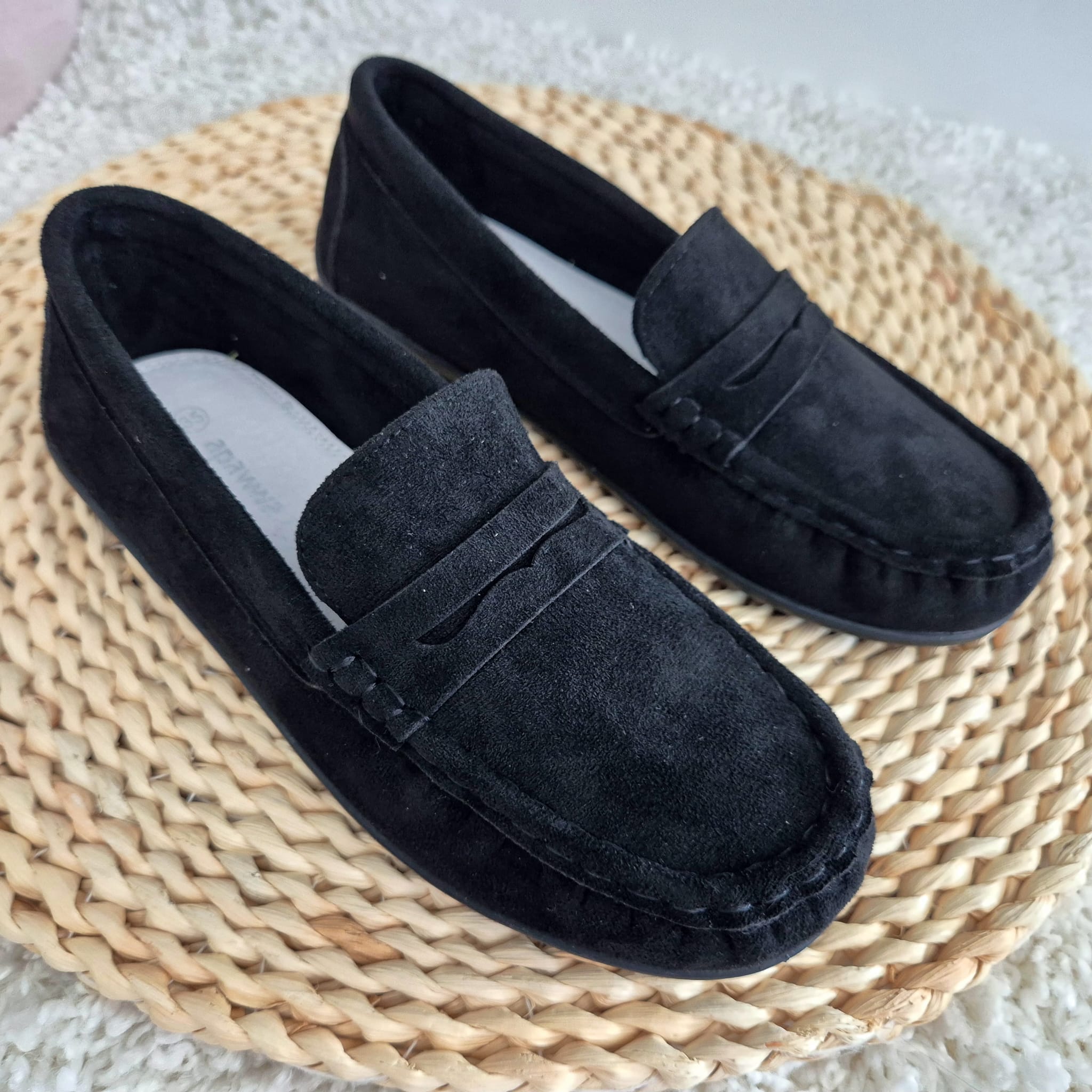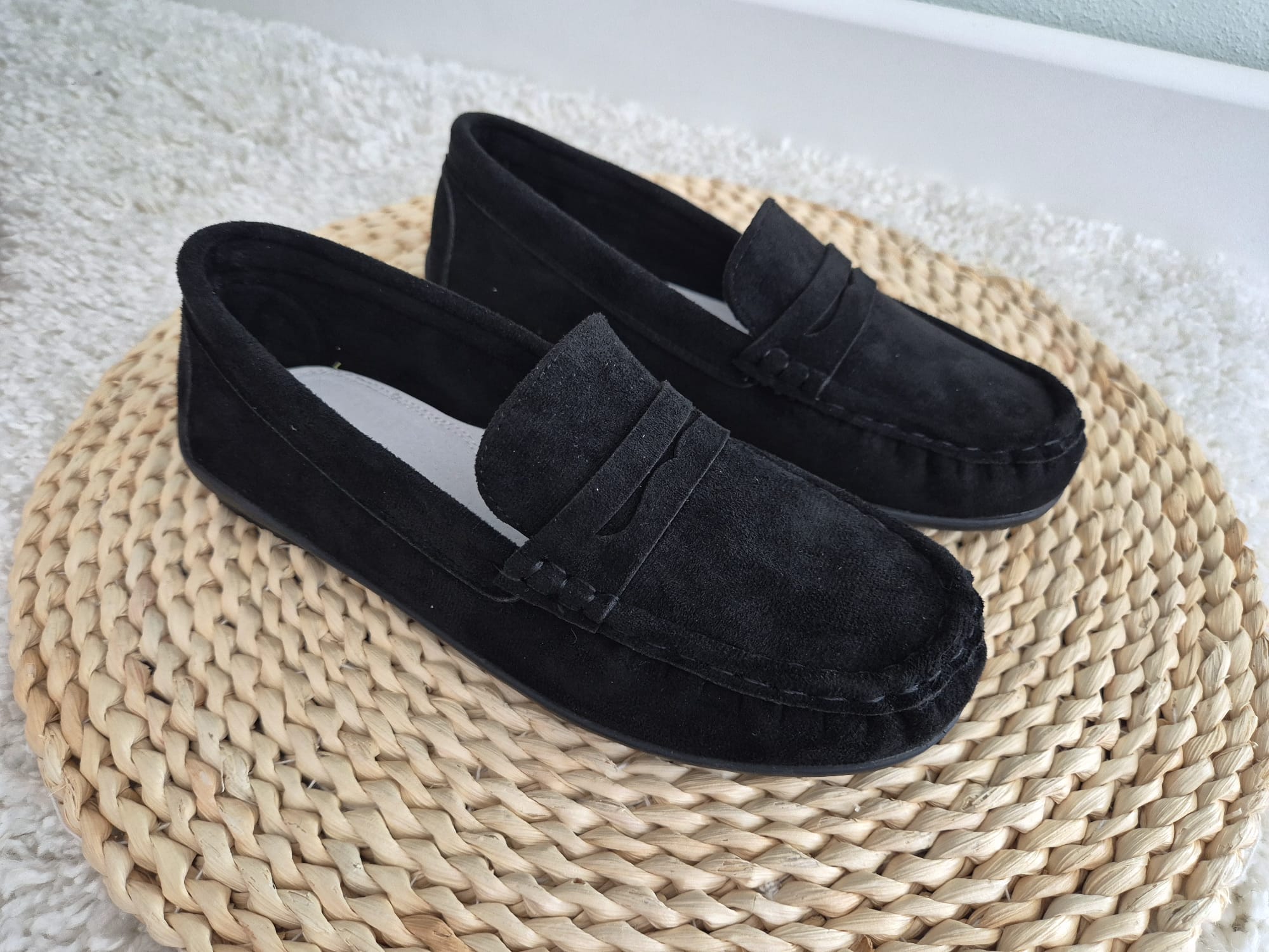 Mokasyny zostały wykonane ze skóry ekologicznej zamszowej, która jest miękka i dobrze dopasowuje się do stopy. Posiadają skórzaną, profilowaną wkładkę oraz charakterystyczne dla mokasyn obszycia. Występują w klasycznym czarnym kolorze.