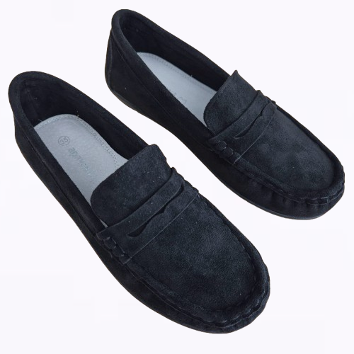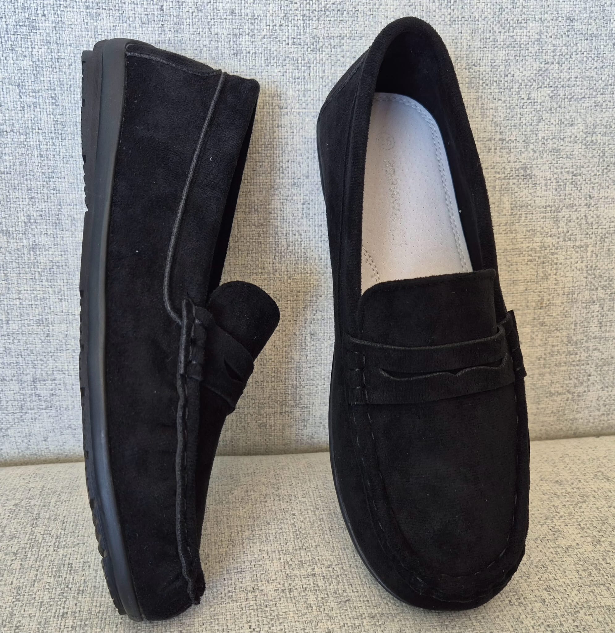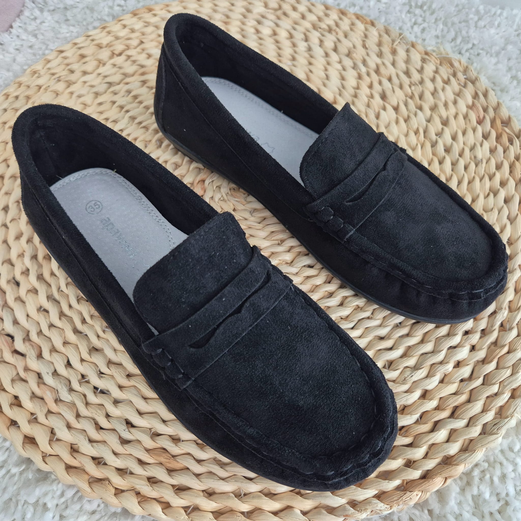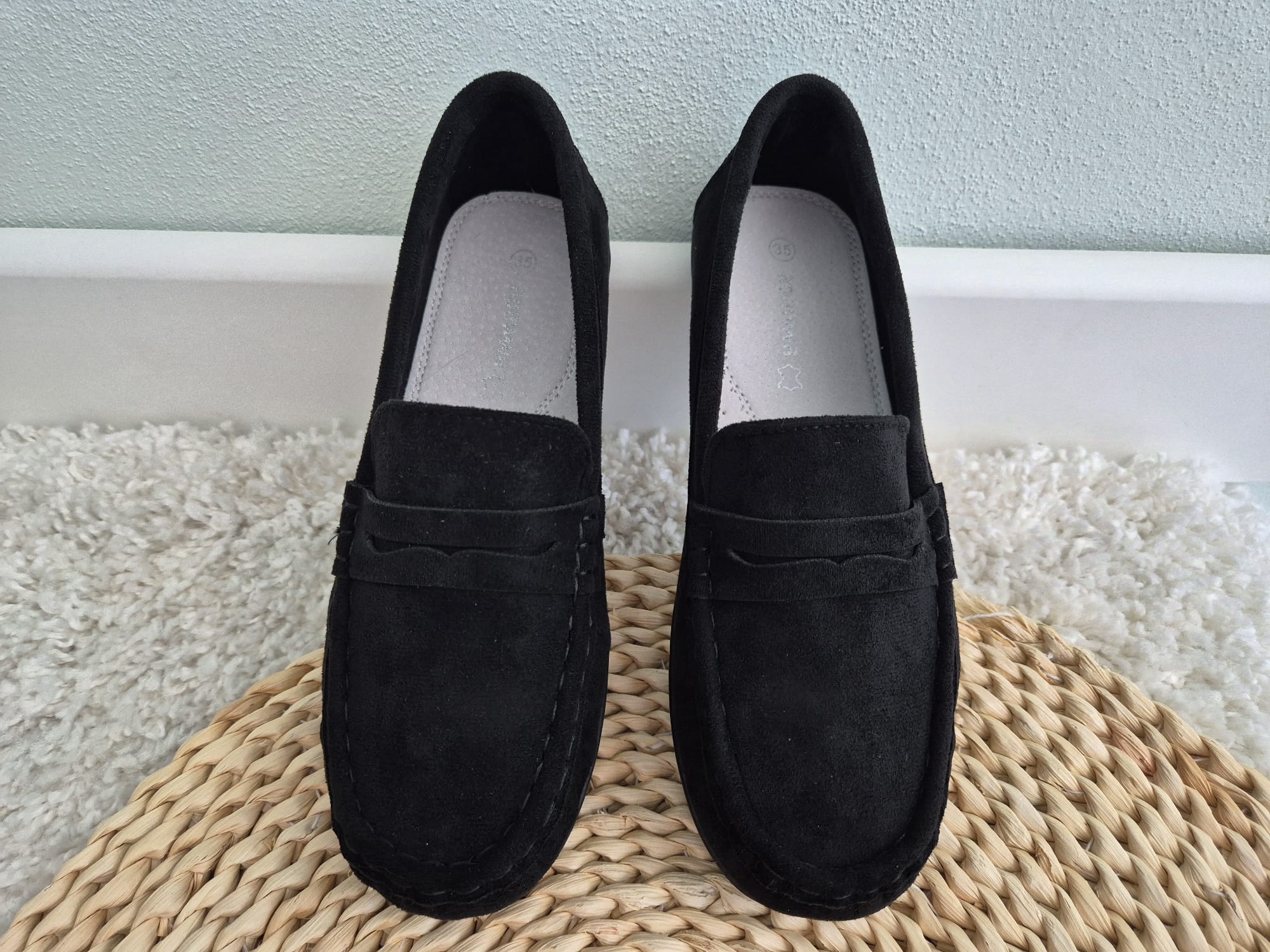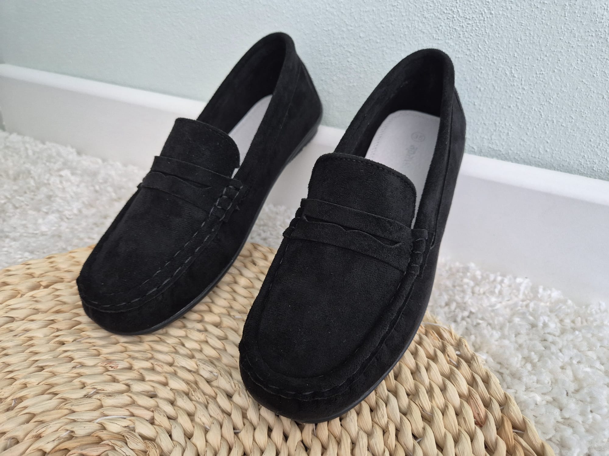 Mokasyny zostały wykonane ze skóry ekologicznej zamszowej, która jest miękka i dobrze dopasowuje się do stopy. Posiadają skórzaną, profilowaną wkładkę oraz charakterystyczne dla mokasyn obszycia. Występują w klasycznym czarnym kolorze.
