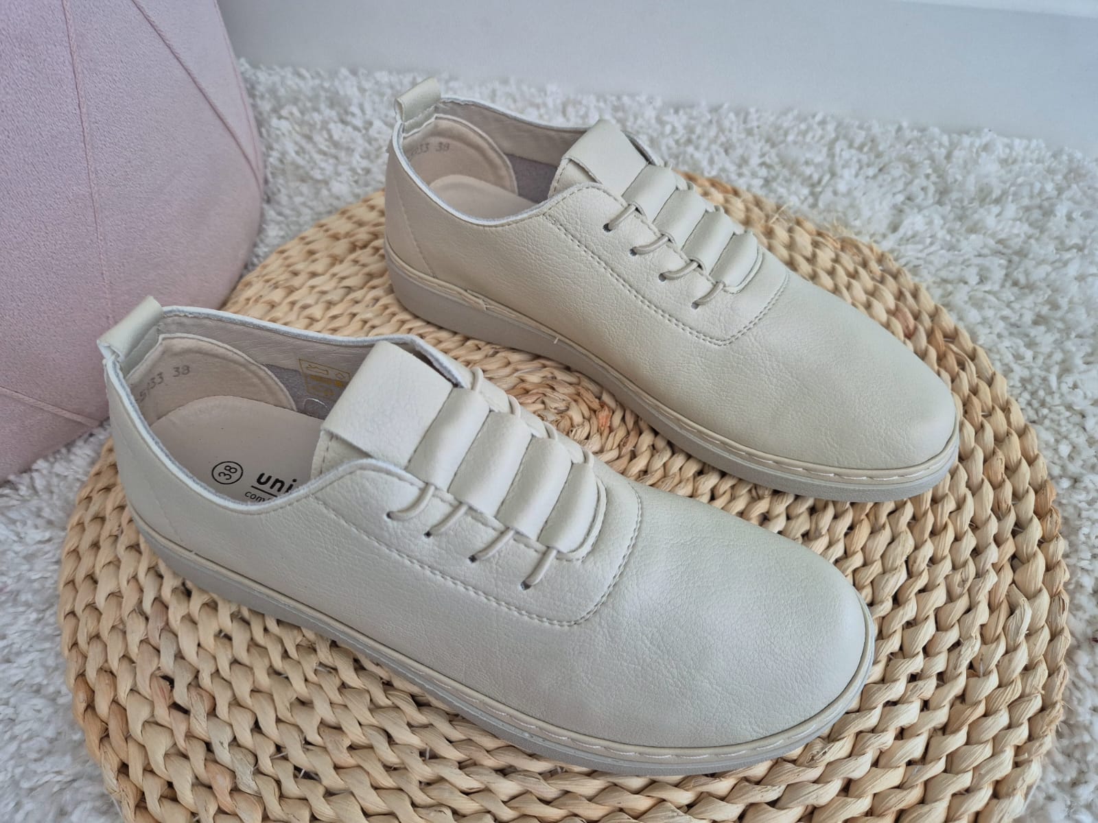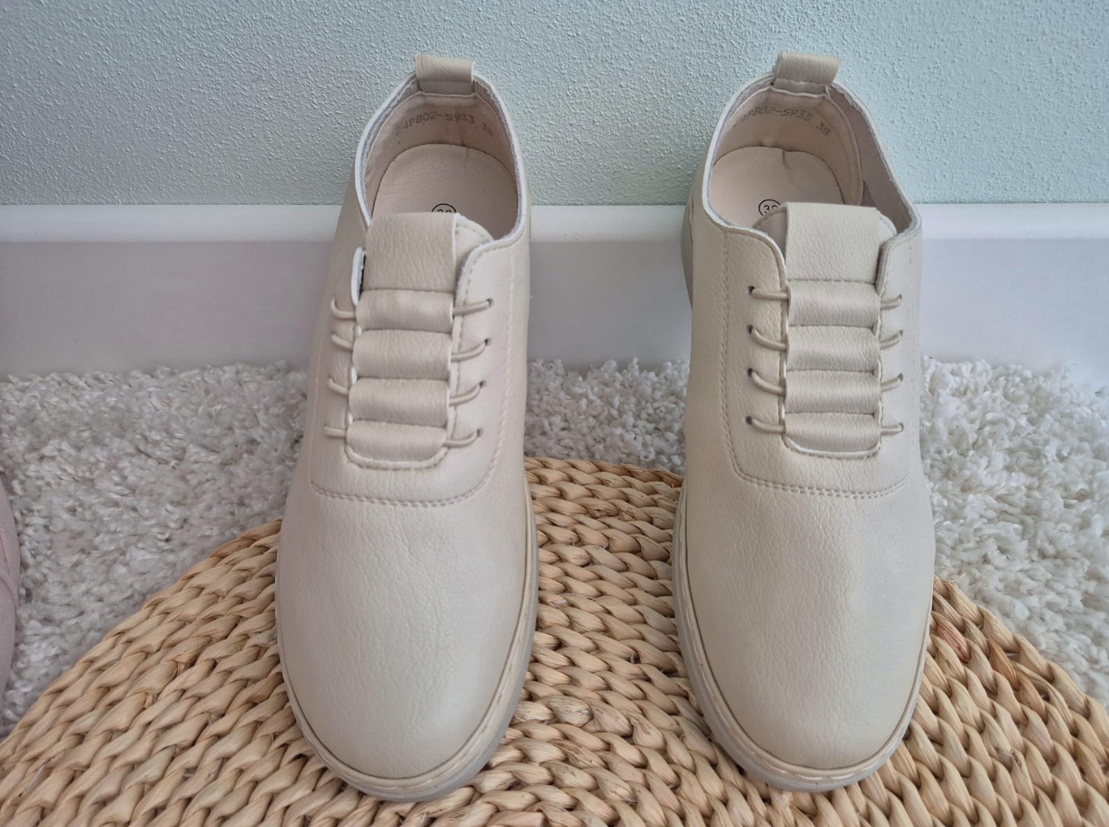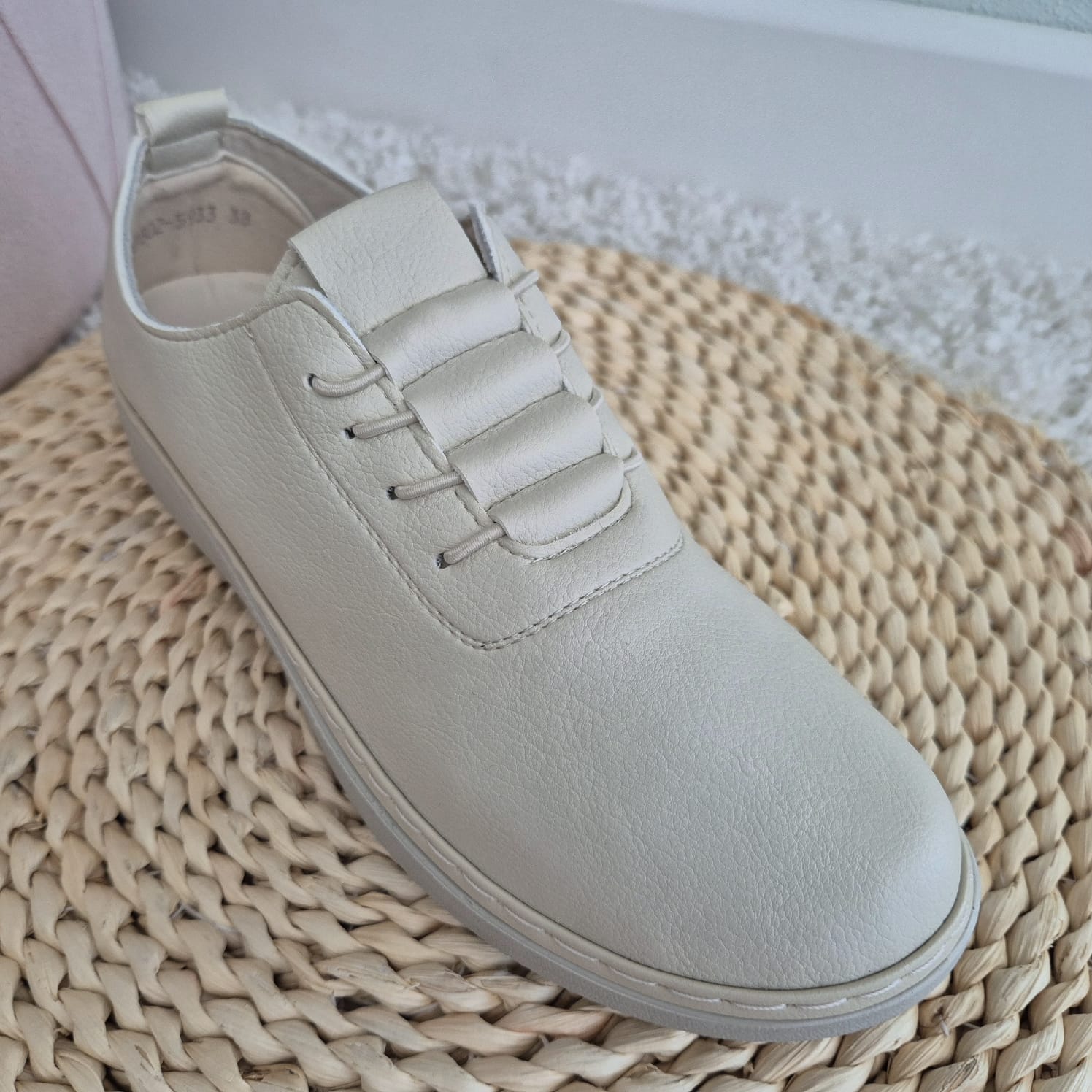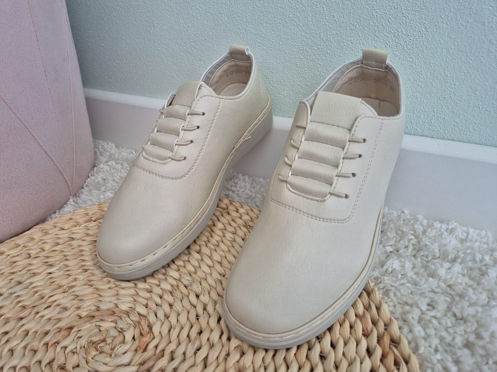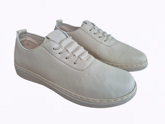 Obuwie zostało wykonane z bardzo miękkiej skóry ekologicznej, która nie powoduje otarć. Zamiast klasycznych sznurówek obuwie posiada gumki, które się rozciągają dzięki czemu obuwie pasuje również na szerokie stopy. Posiadają wkładki ze skóry ekologicznej oraz wyższą podeszwę o wysokości 3 cm.
