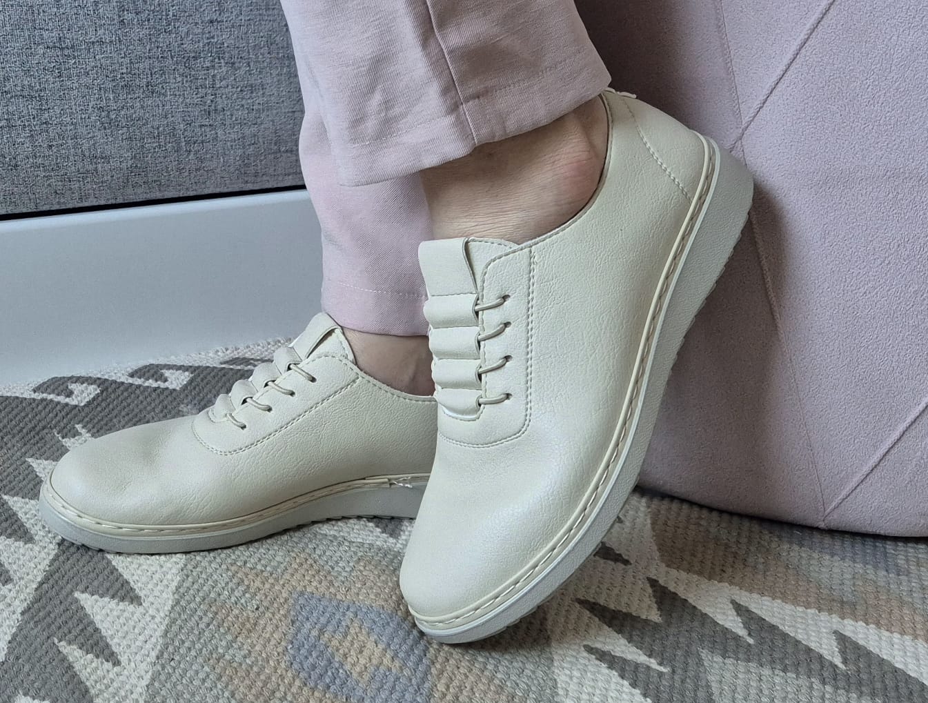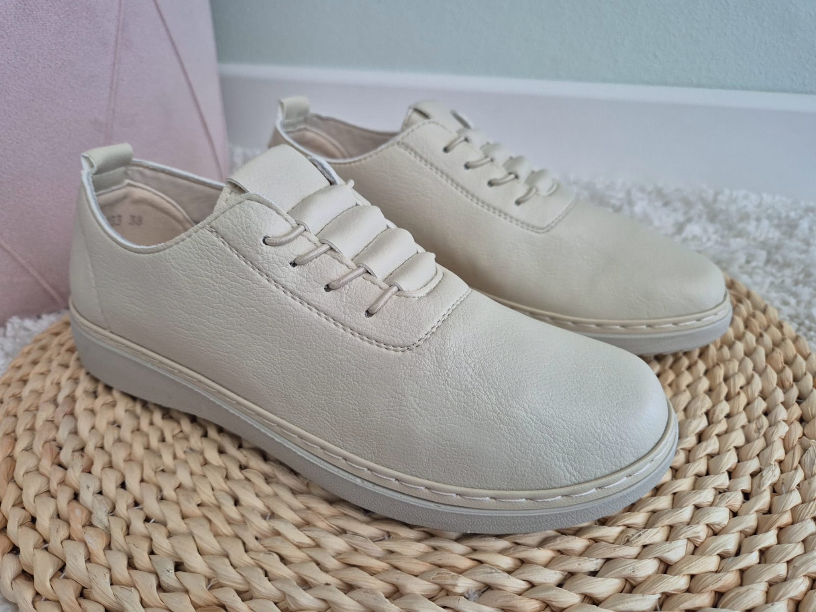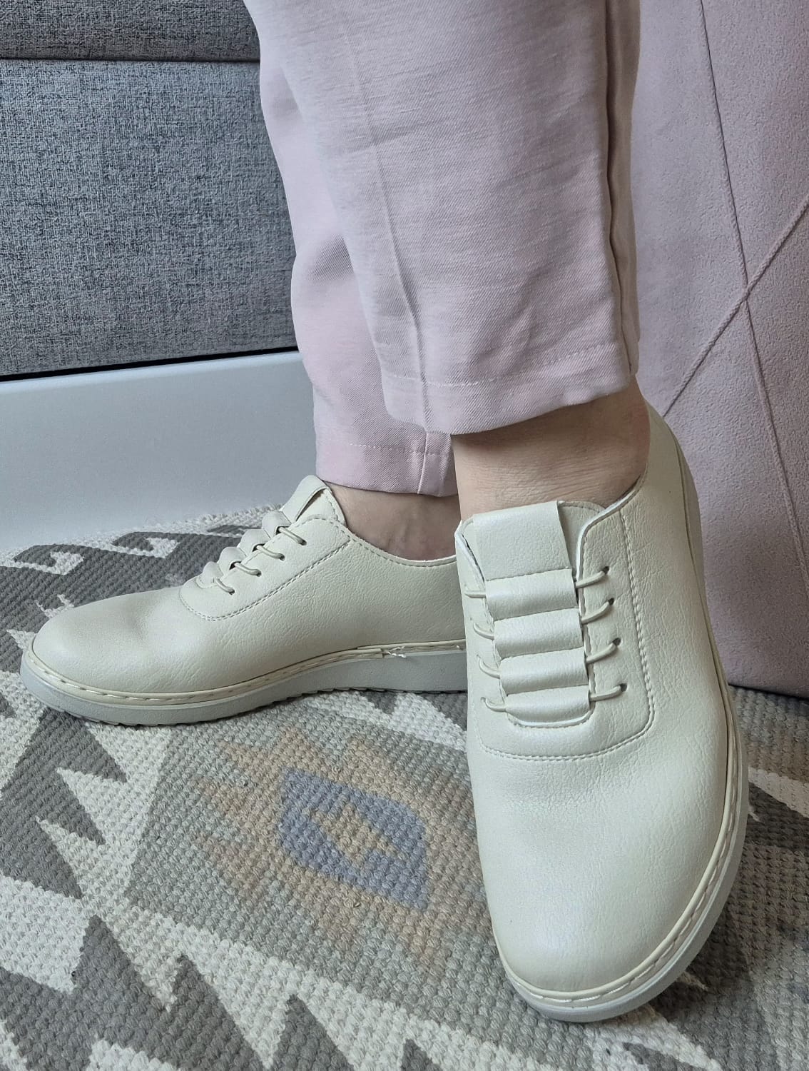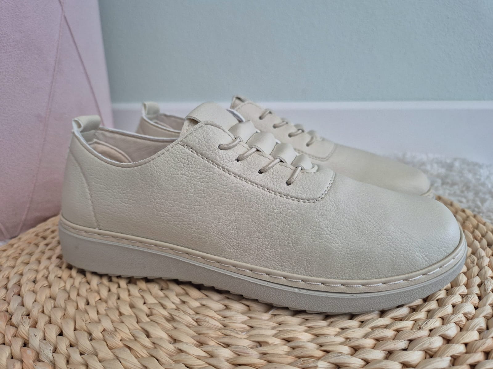 Obuwie zostało wykonane z bardzo miękkiej skóry ekologicznej, która nie powoduje otarć. Zamiast klasycznych sznurówek obuwie posiada gumki, które się rozciągają dzięki czemu obuwie pasuje również na szerokie stopy. Posiadają wkładki ze skóry ekologicznej oraz wyższą podeszwę o wysokości 3 cm.