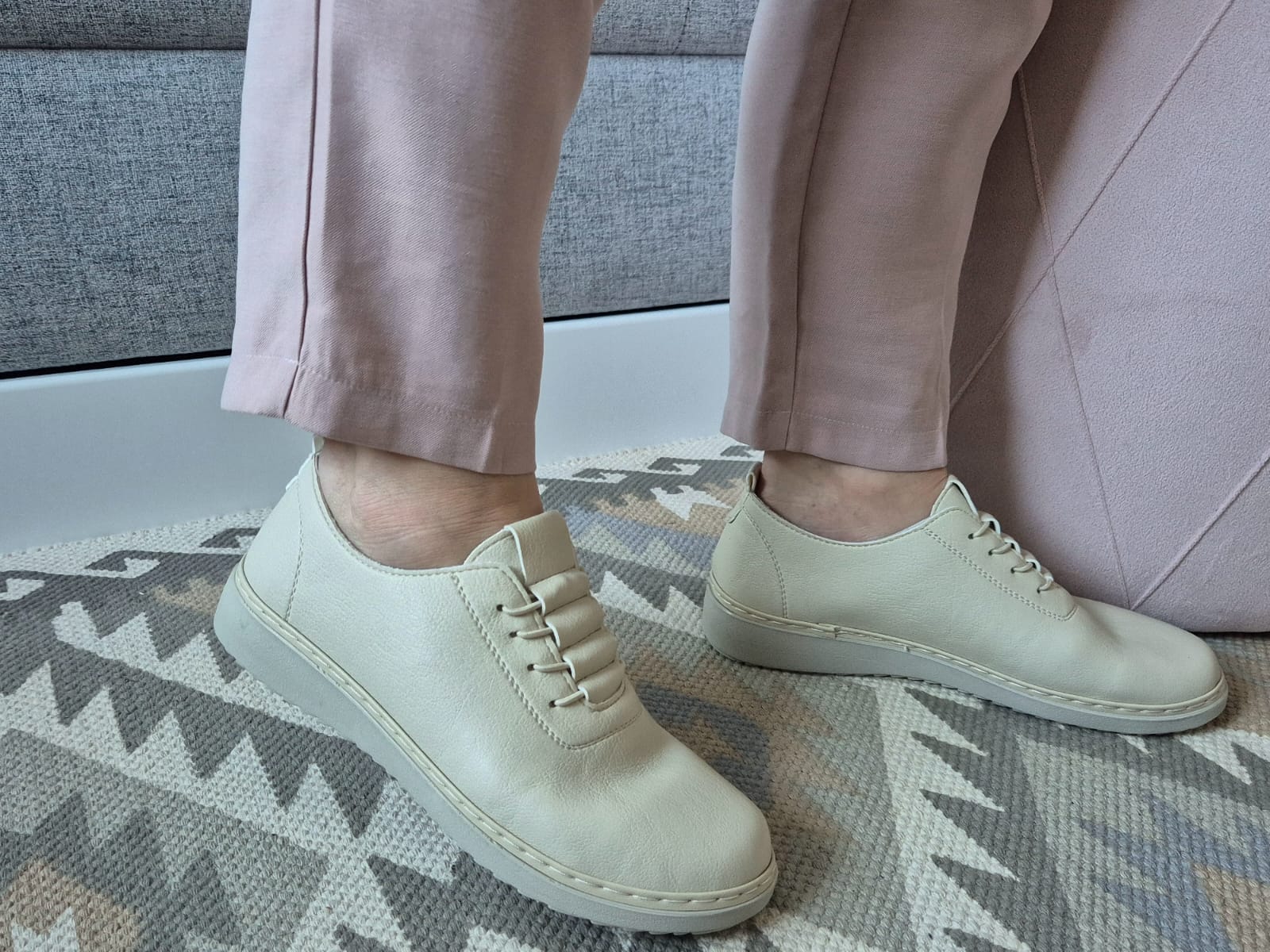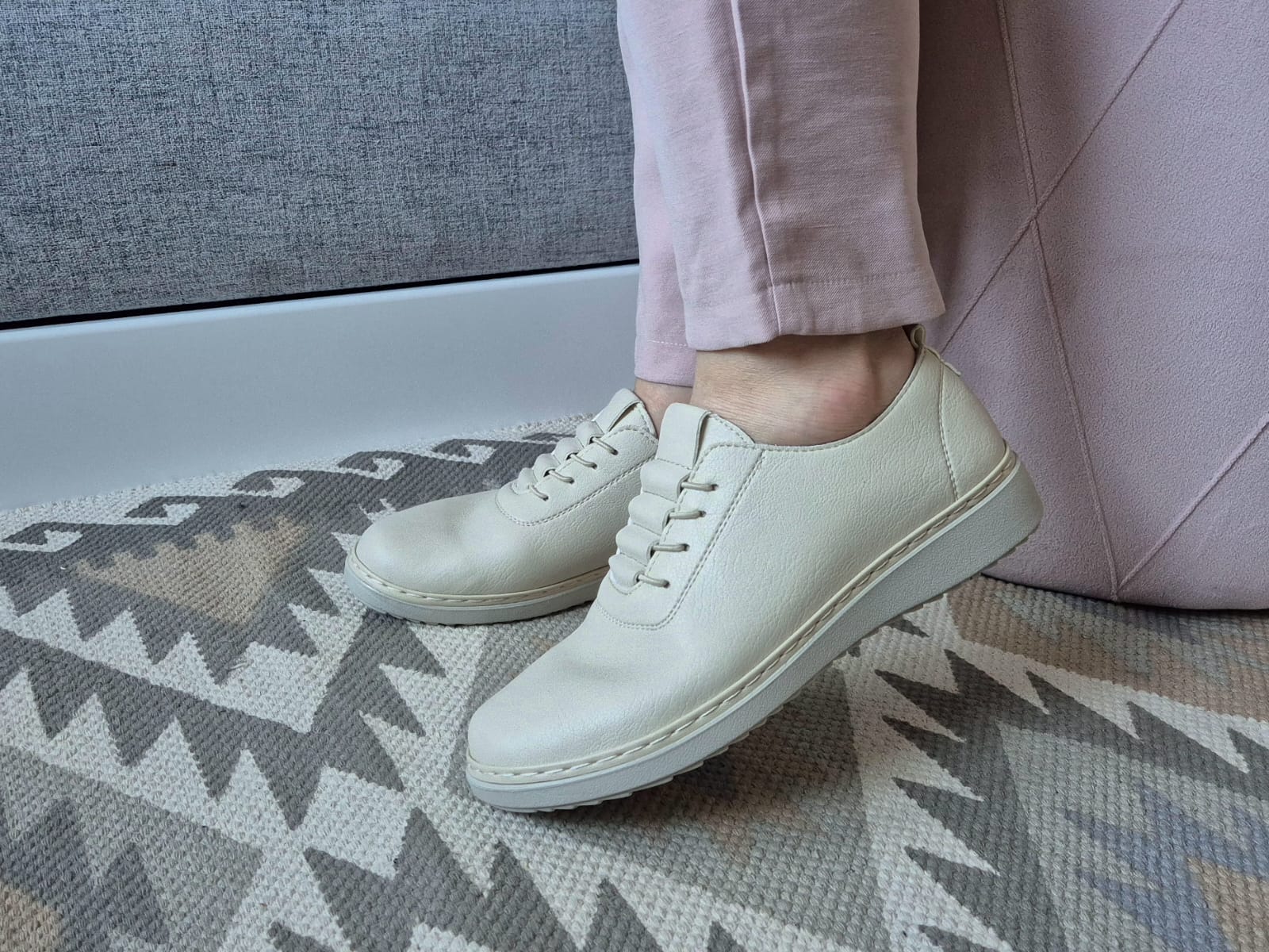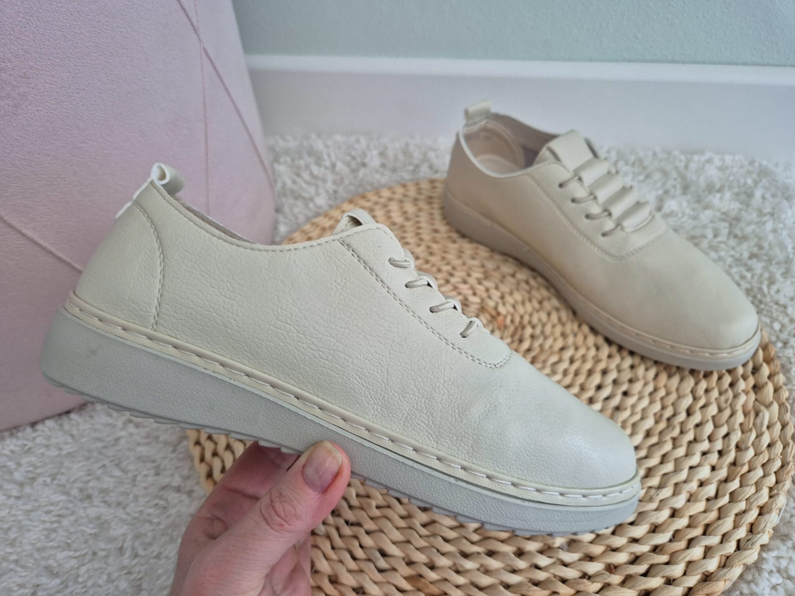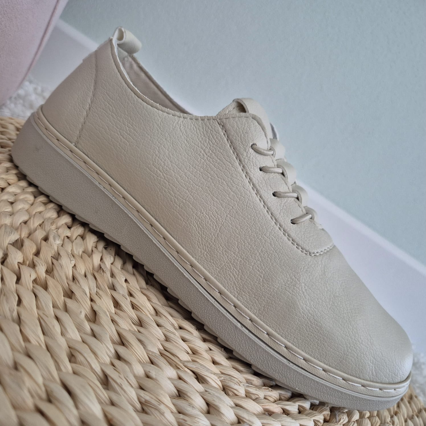 Obuwie zostało wykonane z bardzo miękkiej skóry ekologicznej, która nie powoduje otarć. Zamiast klasycznych sznurówek obuwie posiada gumki, które się rozciągają dzięki czemu obuwie pasuje również na szerokie stopy. Posiadają wkładki ze skóry ekologicznej oraz wyższą podeszwę o wysokości 3 cm.